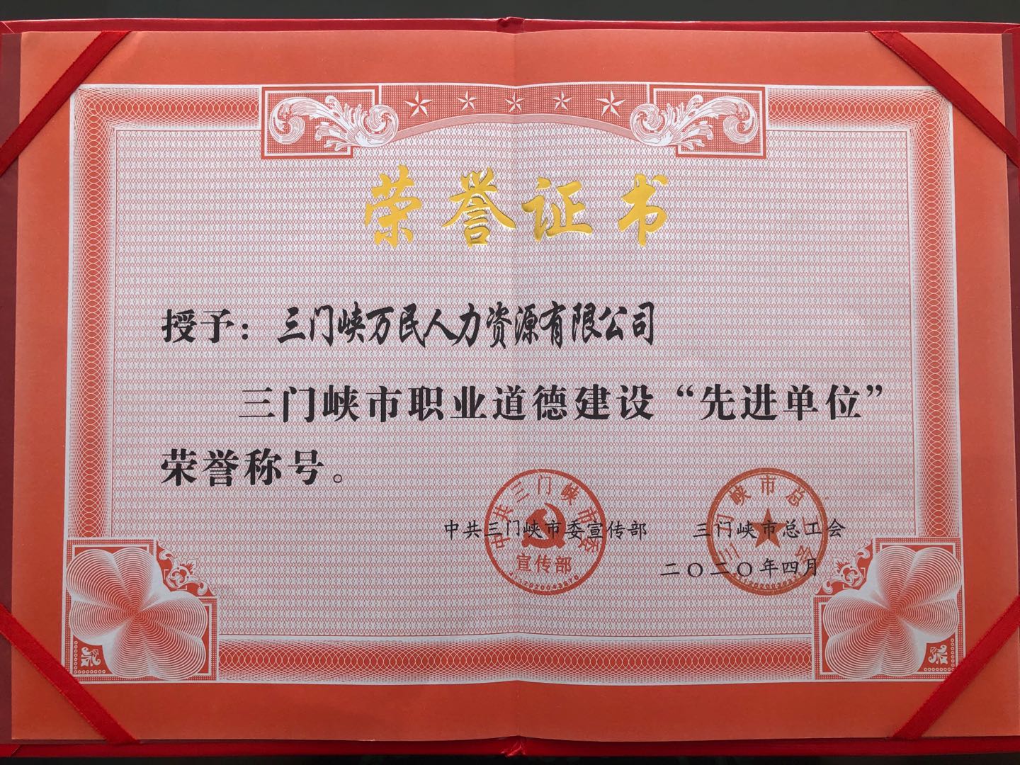 三門峽萬民人力資源有限公司榮獲了2019年度“三門峽市職業(yè)道德建設先進單位”榮譽稱號,我公司將繼續(xù)秉承“追求卓越、真誠服務、以人為本、奉獻社會”的經(jīng)營理念,不忘初心,砥礪前行,珍惜榮譽,充分發(fā)揮好先進典型的示范引領作用,扎實做好各項工作。
